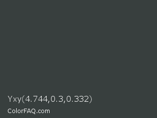 Yxy 4.744,0.3,0.332 Color is a dark cyan color and the nearest color is Cape Cod #3c4443. Hex code #383f3e and RGB value is rgb(56,63,62). In RGB color space, this color is composed of 22% red, 25% green, 24% blue, In CMYK color space, this color is composed of 11% cyan, 0% magenta, 2% yellow , 75% black , In HSL color space, this color has a hue angle of 171° , 6% saturation and 23% lightness.