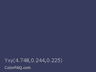 Yxy 4.748,0.244,0.225 Color is a dark blue color and the nearest color is Rhino #2e3f62. Hex code #373b5e and RGB value is rgb(55,59,94). In RGB color space, this color is composed of 22% red, 23% green, 37% blue, In CMYK color space, this color is composed of 41% cyan, 37% magenta, 0% yellow , 63% black , In HSL color space, this color has a hue angle of 234° , 26% saturation and 29% lightness.