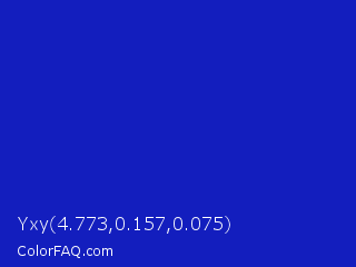 Yxy 4.773,0.157,0.075 Color is a normal blue color and the nearest color is Persian Blue #1c39bb. Hex code #131ebe and RGB value is rgb(19,30,190). In RGB color space, this color is composed of 7% red, 12% green, 75% blue, In CMYK color space, this color is composed of 90% cyan, 84% magenta, 0% yellow , 25% black , In HSL color space, this color has a hue angle of 236° , 82% saturation and 41% lightness.