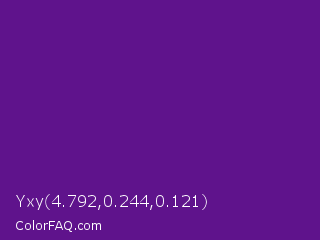 Yxy 4.792,0.244,0.121 Color is a normal purple color and the nearest color is Seance #731e8f. Hex code #5f138c and RGB value is rgb(95,19,140). In RGB color space, this color is composed of 37% red, 7% green, 55% blue, In CMYK color space, this color is composed of 32% cyan, 86% magenta, 0% yellow , 45% black , In HSL color space, this color has a hue angle of 278° , 76% saturation and 31% lightness.