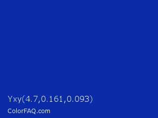 Yxy 4.7,0.161,0.093 Color is a normal blue color and the nearest color is Egyptian Blue #1034a6. Hex code #0b2ca8 and RGB value is rgb(11,44,168). In RGB color space, this color is composed of 4% red, 17% green, 66% blue, In CMYK color space, this color is composed of 93% cyan, 74% magenta, 0% yellow , 34% black , In HSL color space, this color has a hue angle of 227° , 88% saturation and 35% lightness.