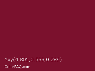 Yxy 4.801,0.533,0.289 Color is a dark rose color and the nearest color is Claret #7f1734. Hex code #7b112d and RGB value is rgb(123,17,45). In RGB color space, this color is composed of 48% red, 7% green, 18% blue, In CMYK color space, this color is composed of 0% cyan, 86% magenta, 63% yellow , 52% black , In HSL color space, this color has a hue angle of 344° , 76% saturation and 27% lightness.
