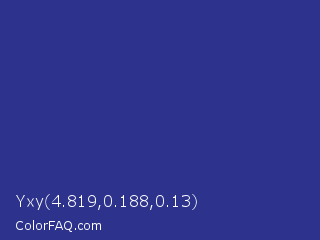 Yxy 4.819,0.188,0.13 Color is a normal blue color and the nearest color is Cosmic Cobalt #2e2d88. Hex code #2d338c and RGB value is rgb(45,51,140). In RGB color space, this color is composed of 18% red, 20% green, 55% blue, In CMYK color space, this color is composed of 68% cyan, 64% magenta, 0% yellow , 45% black , In HSL color space, this color has a hue angle of 236° , 51% saturation and 36% lightness.