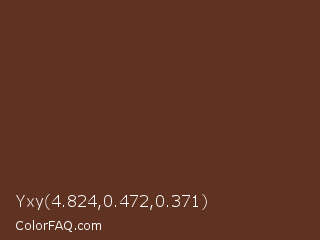 Yxy 4.824,0.472,0.371 Color is a dark orange color and the nearest color is Irish Coffee #5f3d26. Hex code #5f3221 and RGB value is rgb(95,50,33). In RGB color space, this color is composed of 37% red, 20% green, 13% blue, In CMYK color space, this color is composed of 0% cyan, 47% magenta, 65% yellow , 63% black , In HSL color space, this color has a hue angle of 16° , 48% saturation and 25% lightness.