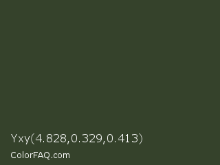 Yxy 4.828,0.329,0.413 Color is a very dark green color and the nearest color is Kombu Green #354230. Hex code #35422b and RGB value is rgb(53,66,43). In RGB color space, this color is composed of 21% red, 26% green, 17% blue, In CMYK color space, this color is composed of 20% cyan, 0% magenta, 35% yellow , 74% black , In HSL color space, this color has a hue angle of 94° , 21% saturation and 21% lightness.