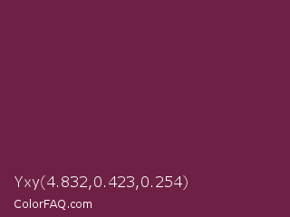 Yxy 4.832,0.423,0.254 Color is a dark rose color and the nearest color is Tawny Port #692545. Hex code #6e2145 and RGB value is rgb(110,33,69). In RGB color space, this color is composed of 43% red, 13% green, 27% blue, In CMYK color space, this color is composed of 0% cyan, 70% magenta, 37% yellow , 57% black , In HSL color space, this color has a hue angle of 332° , 54% saturation and 28% lightness.