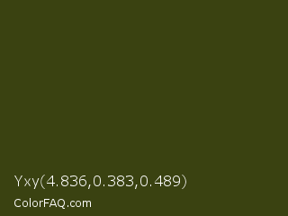 Yxy 4.836,0.383,0.489 Color is a very dark yellow color and the nearest color is Clover #384910. Hex code #3a4211 and RGB value is rgb(58,66,17). In RGB color space, this color is composed of 23% red, 26% green, 7% blue, In CMYK color space, this color is composed of 12% cyan, 0% magenta, 74% yellow , 74% black , In HSL color space, this color has a hue angle of 70° , 59% saturation and 16% lightness.