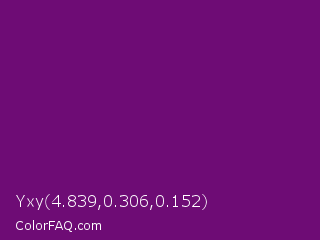Yxy 4.839,0.306,0.152 Color is a dark magenta color and the nearest color is Patriarch #800080. Hex code #6e0c75 and RGB value is rgb(110,12,117). In RGB color space, this color is composed of 43% red, 5% green, 46% blue, In CMYK color space, this color is composed of 6% cyan, 90% magenta, 0% yellow , 54% black , In HSL color space, this color has a hue angle of 296° , 81% saturation and 25% lightness.