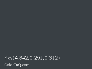 Yxy 4.842,0.291,0.312 Color is a dark blue color and the nearest color is Cape Cod #3c4443. Hex code #393f44 and RGB value is rgb(57,63,68). In RGB color space, this color is composed of 22% red, 25% green, 27% blue, In CMYK color space, this color is composed of 16% cyan, 7% magenta, 0% yellow , 73% black , In HSL color space, this color has a hue angle of 207° , 9% saturation and 25% lightness.