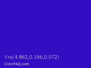 Yxy 4.862,0.166,0.072 Color is a normal indigo color and the nearest color is Interdimensional Blue #360ccc. Hex code #320dc2 and RGB value is rgb(50,13,194). In RGB color space, this color is composed of 20% red, 5% green, 76% blue, In CMYK color space, this color is composed of 74% cyan, 93% magenta, 0% yellow , 24% black , In HSL color space, this color has a hue angle of 252° , 87% saturation and 41% lightness.