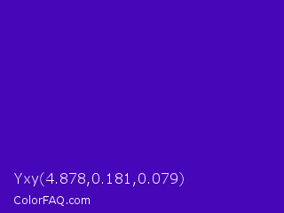 Yxy 4.878,0.181,0.079 Color is a normal violet color and the nearest color is Interdimensional Blue #360ccc. Hex code #4507b8 and RGB value is rgb(69,7,184). In RGB color space, this color is composed of 27% red, 3% green, 72% blue, In CMYK color space, this color is composed of 63% cyan, 96% magenta, 0% yellow , 28% black , In HSL color space, this color has a hue angle of 261° , 93% saturation and 37% lightness.