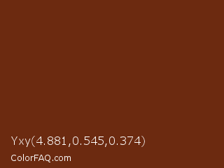 Yxy 4.881,0.545,0.374 Color is a dark orange color and the nearest color is Hairy Heath #6b2a14. Hex code #6c2a10 and RGB value is rgb(108,42,16). In RGB color space, this color is composed of 42% red, 16% green, 6% blue, In CMYK color space, this color is composed of 0% cyan, 61% magenta, 85% yellow , 58% black , In HSL color space, this color has a hue angle of 17° , 74% saturation and 24% lightness.