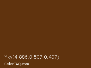 Yxy 4.886,0.507,0.407 Color is a very dark orange color and the nearest color is Jambalaya #5b3013. Hex code #60330e and RGB value is rgb(96,51,14). In RGB color space, this color is composed of 38% red, 20% green, 5% blue, In CMYK color space, this color is composed of 0% cyan, 47% magenta, 85% yellow , 62% black , In HSL color space, this color has a hue angle of 27° , 75% saturation and 22% lightness.