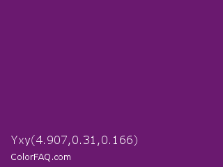 Yxy 4.907,0.31,0.166 Color is a dark magenta color and the nearest color is Midnight #702670. Hex code #6a196f and RGB value is rgb(106,25,111). In RGB color space, this color is composed of 42% red, 10% green, 44% blue, In CMYK color space, this color is composed of 5% cyan, 77% magenta, 0% yellow , 56% black , In HSL color space, this color has a hue angle of 297° , 63% saturation and 27% lightness.
