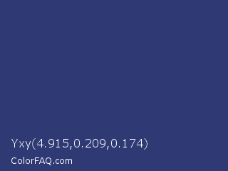 Yxy 4.915,0.209,0.174 Color is a normal blue color and the nearest color is Astronaut #283a77. Hex code #2f3a75 and RGB value is rgb(47,58,117). In RGB color space, this color is composed of 18% red, 23% green, 46% blue, In CMYK color space, this color is composed of 60% cyan, 50% magenta, 0% yellow , 54% black , In HSL color space, this color has a hue angle of 231° , 43% saturation and 32% lightness.