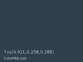 Yxy 4.921,0.258,0.288 Color is a dark blue color and the nearest color is Charcoal #36454f. Hex code #2f414d and RGB value is rgb(47,65,77). In RGB color space, this color is composed of 18% red, 25% green, 30% blue, In CMYK color space, this color is composed of 39% cyan, 16% magenta, 0% yellow , 70% black , In HSL color space, this color has a hue angle of 204° , 24% saturation and 24% lightness.
