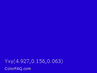 Yxy 4.927,0.156,0.063 Color is a normal indigo color and the nearest color is Interdimensional Blue #360ccc. Hex code #2100d2 and RGB value is rgb(33,0,210). In RGB color space, this color is composed of 13% red, 0% green, 82% blue, In CMYK color space, this color is composed of 84% cyan, 100% magenta, 0% yellow , 18% black , In HSL color space, this color has a hue angle of 249° , 100% saturation and 41% lightness.
