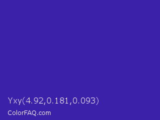 Yxy 4.92,0.181,0.093 Color is a normal indigo color and the nearest color is Blue Pigment #333399. Hex code #3b21aa and RGB value is rgb(59,33,170). In RGB color space, this color is composed of 23% red, 13% green, 67% blue, In CMYK color space, this color is composed of 65% cyan, 81% magenta, 0% yellow , 33% black , In HSL color space, this color has a hue angle of 251° , 67% saturation and 40% lightness.