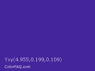 Yxy 4.955,0.199,0.109 Color is a normal indigo color and the nearest color is Daisy Bush #4f2398. Hex code #45259b and RGB value is rgb(69,37,155). In RGB color space, this color is composed of 27% red, 15% green, 61% blue, In CMYK color space, this color is composed of 55% cyan, 76% magenta, 0% yellow , 39% black , In HSL color space, this color has a hue angle of 256° , 61% saturation and 38% lightness.