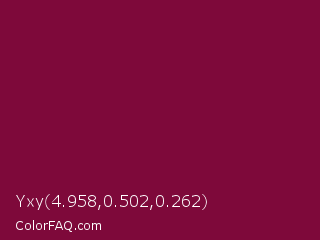 Yxy 4.958,0.502,0.262 Color is a dark rose color and the nearest color is Siren #7a013a. Hex code #7e093a and RGB value is rgb(126,9,58). In RGB color space, this color is composed of 49% red, 4% green, 23% blue, In CMYK color space, this color is composed of 0% cyan, 93% magenta, 54% yellow , 51% black , In HSL color space, this color has a hue angle of 335° , 87% saturation and 26% lightness.