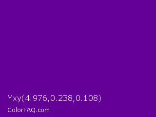 Yxy 4.976,0.238,0.108 Color is a dark purple color and the nearest color is Purple #660099. Hex code #640098 and RGB value is rgb(100,0,152). In RGB color space, this color is composed of 39% red, 0% green, 60% blue, In CMYK color space, this color is composed of 34% cyan, 100% magenta, 0% yellow , 40% black , In HSL color space, this color has a hue angle of 279° , 100% saturation and 30% lightness.