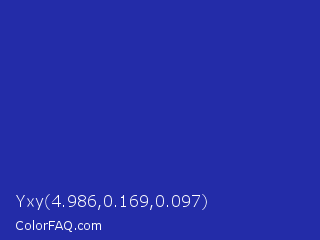 Yxy 4.986,0.169,0.097 Color is a normal blue color and the nearest color is Egyptian Blue #1034a6. Hex code #232ca8 and RGB value is rgb(35,44,168). In RGB color space, this color is composed of 14% red, 17% green, 66% blue, In CMYK color space, this color is composed of 79% cyan, 74% magenta, 0% yellow , 34% black , In HSL color space, this color has a hue angle of 236° , 66% saturation and 40% lightness.