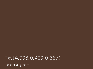 Yxy 4.993,0.409,0.367 Color is a dark orange color and the nearest color is Rock #4d3833. Hex code #54392c and RGB value is rgb(84,57,44). In RGB color space, this color is composed of 33% red, 22% green, 17% blue, In CMYK color space, this color is composed of 0% cyan, 32% magenta, 48% yellow , 67% black , In HSL color space, this color has a hue angle of 20° , 31% saturation and 25% lightness.