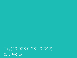 Yxy 40.023,0.231,0.342 Color is a normal cyan color and the nearest color is Java #1fc2c2. Hex code #1cbdb5 and RGB value is rgb(28,189,181). In RGB color space, this color is composed of 11% red, 74% green, 71% blue, In CMYK color space, this color is composed of 85% cyan, 0% magenta, 4% yellow , 26% black , In HSL color space, this color has a hue angle of 177° , 74% saturation and 43% lightness.
