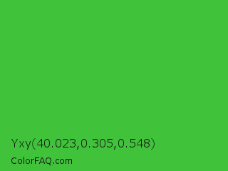 Yxy 40.023,0.305,0.548 Color is a normal green color and the nearest color is Lime Green #32cd32. Hex code #41c23b and RGB value is rgb(65,194,59). In RGB color space, this color is composed of 25% red, 76% green, 23% blue, In CMYK color space, this color is composed of 66% cyan, 0% magenta, 70% yellow , 24% black , In HSL color space, this color has a hue angle of 117° , 53% saturation and 50% lightness.