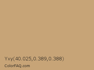 Yxy 40.025,0.389,0.388 Color is a light orange color and the nearest color is Light French Beige #c8ad7f. Hex code #c7a477 and RGB value is rgb(199,164,119). In RGB color space, this color is composed of 78% red, 64% green, 47% blue, In CMYK color space, this color is composed of 0% cyan, 18% magenta, 40% yellow , 22% black , In HSL color space, this color has a hue angle of 34° , 42% saturation and 62% lightness.