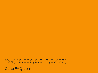 Yxy 40.036,0.517,0.427 Color is a normal orange color and the nearest color is Pizazz #ff9000. Hex code #f79103 and RGB value is rgb(247,145,3). In RGB color space, this color is composed of 97% red, 57% green, 1% blue, In CMYK color space, this color is composed of 0% cyan, 41% magenta, 99% yellow , 3% black , In HSL color space, this color has a hue angle of 35° , 98% saturation and 49% lightness.