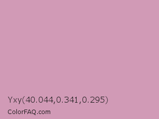 Yxy 40.044,0.341,0.295 Color is a light rose color and the nearest color is Careys Pink #d29eaa. Hex code #d19ab6 and RGB value is rgb(209,154,182). In RGB color space, this color is composed of 82% red, 60% green, 71% blue, In CMYK color space, this color is composed of 0% cyan, 26% magenta, 13% yellow , 18% black , In HSL color space, this color has a hue angle of 329° , 37% saturation and 71% lightness.