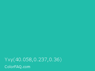 Yxy 40.058,0.237,0.36 Color is a normal cyan color and the nearest color is Light Sea Green #20b2aa. Hex code #21beab and RGB value is rgb(33,190,171). In RGB color space, this color is composed of 13% red, 75% green, 67% blue, In CMYK color space, this color is composed of 83% cyan, 0% magenta, 10% yellow , 25% black , In HSL color space, this color has a hue angle of 173° , 70% saturation and 44% lightness.