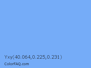 Yxy 40.064,0.225,0.231 Color is a light blue color and the nearest color is French Sky Blue #77b5fe. Hex code #75acf8 and RGB value is rgb(117,172,248). In RGB color space, this color is composed of 46% red, 67% green, 97% blue, In CMYK color space, this color is composed of 53% cyan, 31% magenta, 0% yellow , 3% black , In HSL color space, this color has a hue angle of 215° , 90% saturation and 72% lightness.