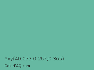 Yxy 40.073,0.267,0.365 Color is a normal green color and the nearest color is Tradewind #5fb3ac. Hex code #66b9a2 and RGB value is rgb(102,185,162). In RGB color space, this color is composed of 40% red, 73% green, 64% blue, In CMYK color space, this color is composed of 45% cyan, 0% magenta, 12% yellow , 27% black , In HSL color space, this color has a hue angle of 163° , 37% saturation and 56% lightness.