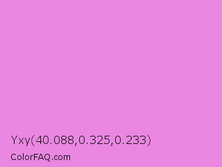 Yxy 40.088,0.325,0.233 Color is a light magenta color and the nearest color is Lavender Magenta #ee82ee. Hex code #e987e1 and RGB value is rgb(233,135,225). In RGB color space, this color is composed of 91% red, 53% green, 88% blue, In CMYK color space, this color is composed of 0% cyan, 42% magenta, 3% yellow , 9% black , In HSL color space, this color has a hue angle of 305° , 69% saturation and 72% lightness.