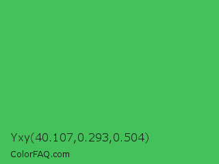 Yxy 40.107,0.293,0.504 Color is a normal green color and the nearest color is Chateau Green #40a860. Hex code #44c15a and RGB value is rgb(68,193,90). In RGB color space, this color is composed of 27% red, 76% green, 35% blue, In CMYK color space, this color is composed of 65% cyan, 0% magenta, 53% yellow , 24% black , In HSL color space, this color has a hue angle of 131° , 50% saturation and 51% lightness.
