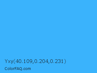 Yxy 40.109,0.204,0.231 Color is a light blue color and the nearest color is Picton Blue #45b1e8. Hex code #3ab3fc and RGB value is rgb(58,179,252). In RGB color space, this color is composed of 23% red, 70% green, 99% blue, In CMYK color space, this color is composed of 77% cyan, 29% magenta, 0% yellow , 1% black , In HSL color space, this color has a hue angle of 203° , 97% saturation and 61% lightness.