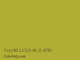 Yxy 40.113,0.41,0.479 Color is a normal yellow color and the nearest color is Brass #b5a642. Hex code #b3ae35 and RGB value is rgb(179,174,53). In RGB color space, this color is composed of 70% red, 68% green, 21% blue, In CMYK color space, this color is composed of 0% cyan, 3% magenta, 70% yellow , 30% black , In HSL color space, this color has a hue angle of 58° , 54% saturation and 45% lightness.