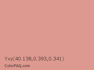 Yxy 40.138,0.393,0.341 Color is a light red color and the nearest color is Petite Orchid #db9690. Hex code #dd998f and RGB value is rgb(221,153,143). In RGB color space, this color is composed of 87% red, 60% green, 56% blue, In CMYK color space, this color is composed of 0% cyan, 31% magenta, 35% yellow , 13% black , In HSL color space, this color has a hue angle of 8° , 53% saturation and 71% lightness.