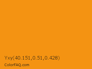 Yxy 40.151,0.51,0.428 Color is a normal orange color and the nearest color is West Side #ff910f. Hex code #f49312 and RGB value is rgb(244,147,18). In RGB color space, this color is composed of 96% red, 58% green, 7% blue, In CMYK color space, this color is composed of 0% cyan, 40% magenta, 93% yellow , 4% black , In HSL color space, this color has a hue angle of 34° , 91% saturation and 51% lightness.