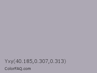 Yxy 40.185,0.307,0.313 Color is a light violet color and the nearest color is Spun Pearl #aaabb7. Hex code #ada8b4 and RGB value is rgb(173,168,180). In RGB color space, this color is composed of 68% red, 66% green, 71% blue, In CMYK color space, this color is composed of 4% cyan, 7% magenta, 0% yellow , 29% black , In HSL color space, this color has a hue angle of 265° , 7% saturation and 68% lightness.
