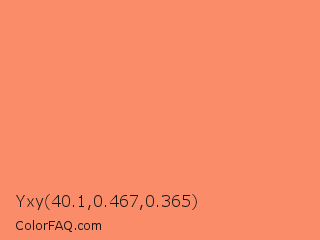 Yxy 40.1,0.467,0.365 Color is a light red color and the nearest color is Salmon #ff8c69. Hex code #fa8c69 and RGB value is rgb(250,140,105). In RGB color space, this color is composed of 98% red, 55% green, 41% blue, In CMYK color space, this color is composed of 0% cyan, 44% magenta, 58% yellow , 2% black , In HSL color space, this color has a hue angle of 14° , 94% saturation and 70% lightness.
