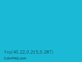 Yxy 40.22,0.215,0.287 Color is a normal cyan color and the nearest color is Battery Charged Blue #1dacd6. Hex code #1abad6 and RGB value is rgb(26,186,214). In RGB color space, this color is composed of 10% red, 73% green, 84% blue, In CMYK color space, this color is composed of 88% cyan, 13% magenta, 0% yellow , 16% black , In HSL color space, this color has a hue angle of 189° , 78% saturation and 47% lightness.