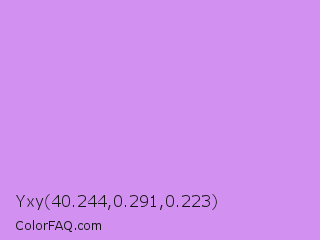 Yxy 40.244,0.291,0.223 Color is a light purple color and the nearest color is Bright Lilac #d891ef. Hex code #d291f0 and RGB value is rgb(210,145,240). In RGB color space, this color is composed of 82% red, 57% green, 94% blue, In CMYK color space, this color is composed of 13% cyan, 40% magenta, 0% yellow , 6% black , In HSL color space, this color has a hue angle of 281° , 76% saturation and 75% lightness.