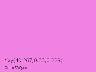 Yxy 40.267,0.33,0.228 Color is a light magenta color and the nearest color is Pale Magenta #f984e5. Hex code #f182e4 and RGB value is rgb(241,130,228). In RGB color space, this color is composed of 95% red, 51% green, 89% blue, In CMYK color space, this color is composed of 0% cyan, 46% magenta, 5% yellow , 5% black , In HSL color space, this color has a hue angle of 307° , 80% saturation and 73% lightness.
