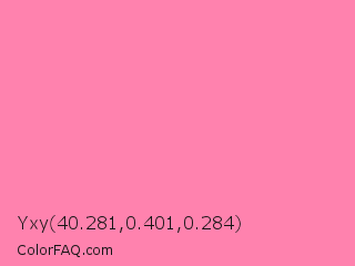 Yxy 40.281,0.401,0.284 Color is a light rose color and the nearest color is Tickle Me Pink #fc89ac. Hex code #ff82ae and RGB value is rgb(255,130,174). In RGB color space, this color is composed of 100% red, 51% green, 68% blue, In CMYK color space, this color is composed of 0% cyan, 49% magenta, 32% yellow , 0% black , In HSL color space, this color has a hue angle of 339° , 100% saturation and 75% lightness.
