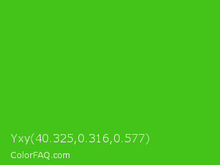 Yxy 40.325,0.316,0.577 Color is a normal green color and the nearest color is Harlequin Green #46cb18. Hex code #44c318 and RGB value is rgb(68,195,24). In RGB color space, this color is composed of 27% red, 76% green, 9% blue, In CMYK color space, this color is composed of 65% cyan, 0% magenta, 88% yellow , 24% black , In HSL color space, this color has a hue angle of 105° , 78% saturation and 43% lightness.