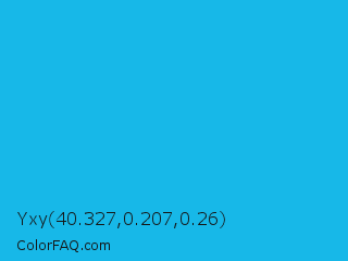 Yxy 40.327,0.207,0.26 Color is a normal blue color and the nearest color is Battery Charged Blue #1dacd6. Hex code #17b8e8 and RGB value is rgb(23,184,232). In RGB color space, this color is composed of 9% red, 72% green, 91% blue, In CMYK color space, this color is composed of 90% cyan, 21% magenta, 0% yellow , 9% black , In HSL color space, this color has a hue angle of 194° , 82% saturation and 50% lightness.