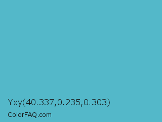 Yxy 40.337,0.235,0.303 Color is a normal cyan color and the nearest color is Fountain Blue #56b4be. Hex code #53b8c9 and RGB value is rgb(83,184,201). In RGB color space, this color is composed of 33% red, 72% green, 79% blue, In CMYK color space, this color is composed of 59% cyan, 8% magenta, 0% yellow , 21% black , In HSL color space, this color has a hue angle of 189° , 52% saturation and 56% lightness.
